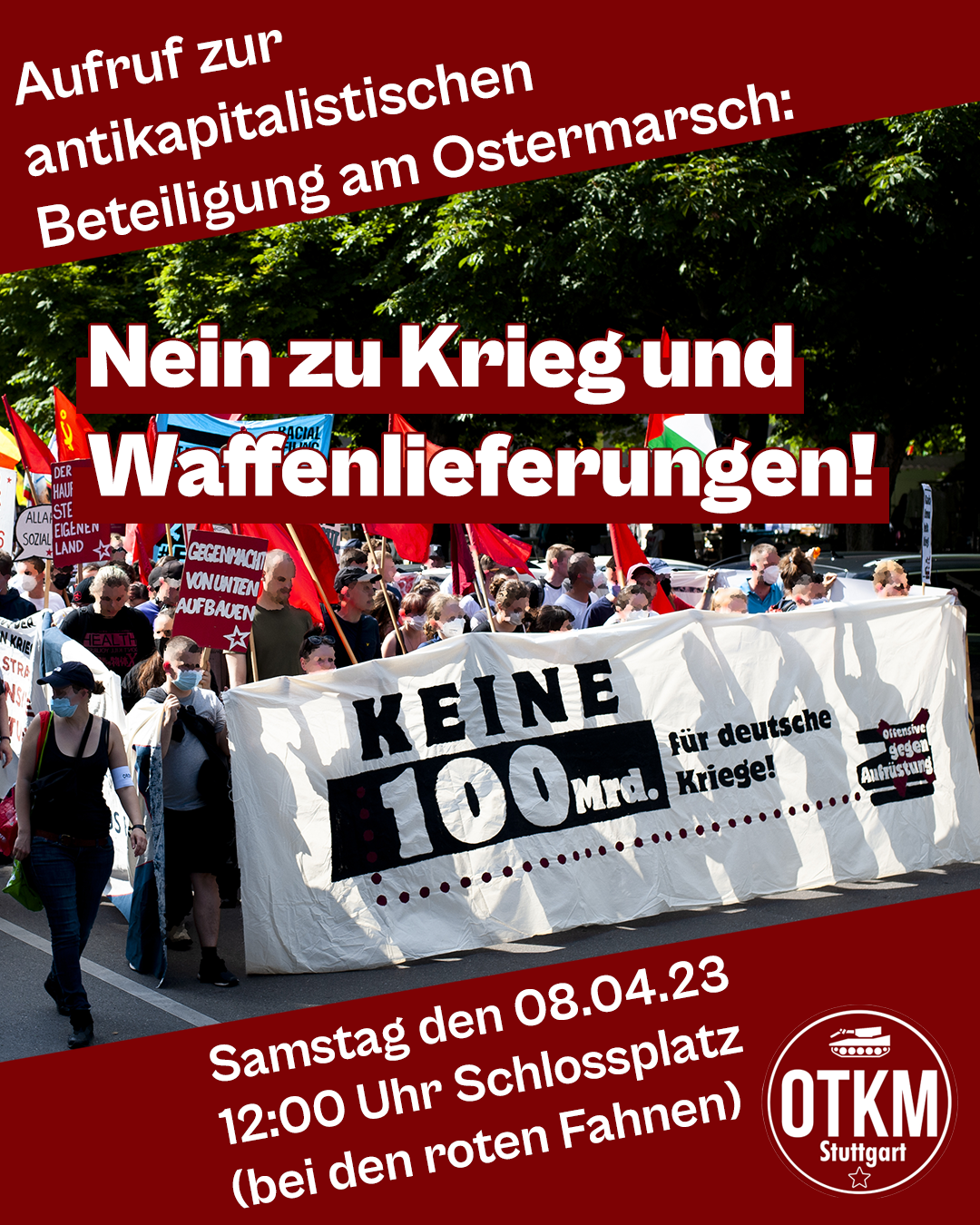 Kommt mit uns zusammen am 08.04 um 12 Uhr auf den Schlossplatz damit wir uns gemeinsam am antikapitalistischen Block auf dem Ostermarsch beteiligen können.
