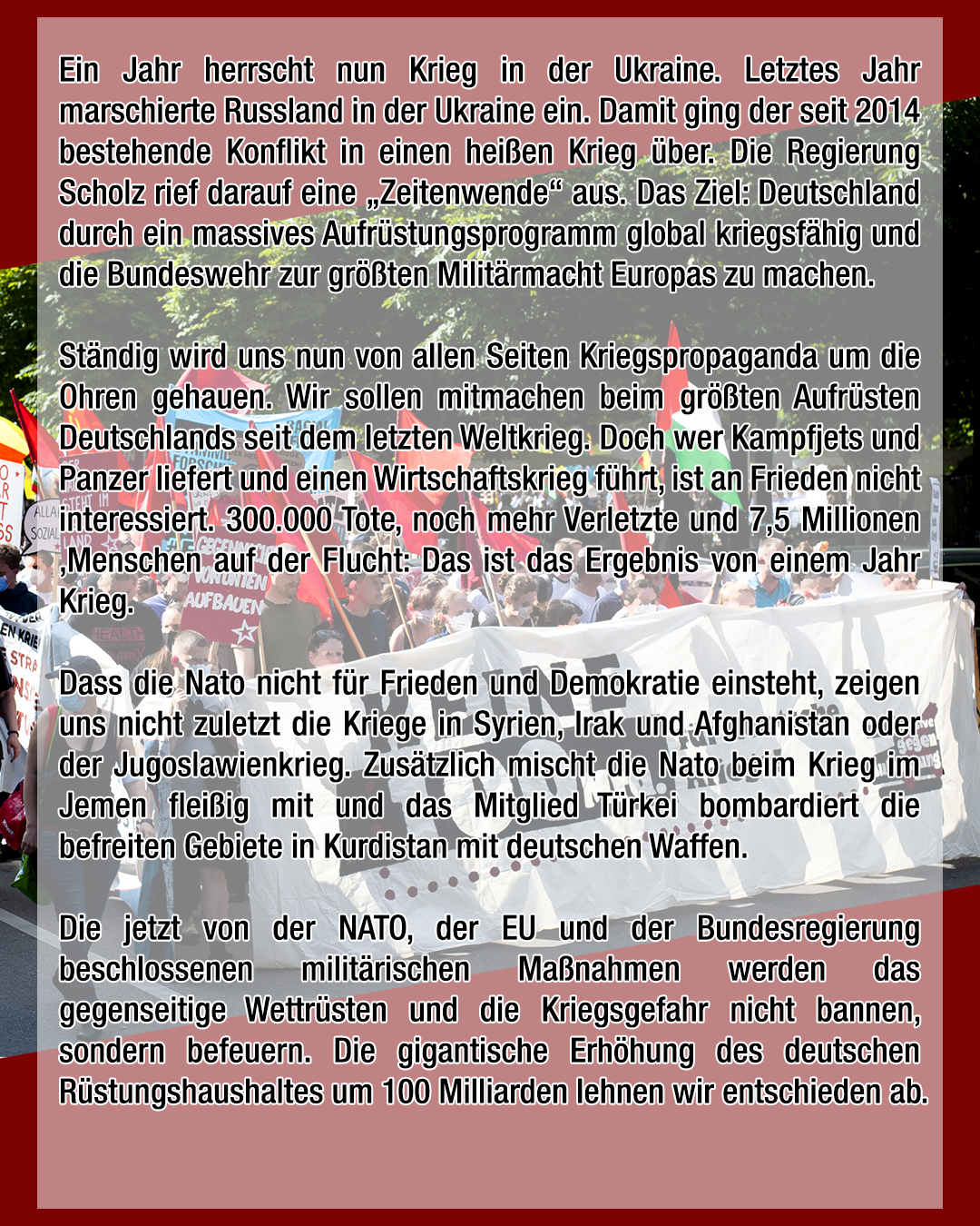 Ständig wird uns nun von allen Seiten Kriegspropaganda um die Ohren gehauen. Wir sollen mitmachen beim größten Aufrüsten Deutschlands seit dem letzten Weltkrieg. Doch wer Kampfjets und Panzer liefert und einen Wirtschaftskrieg führt, ist an Frieden nicht interessiert. 300.000 Tote, noch mehr Verletzte und 7,5 Millionen ,Menschen auf der Flucht: Das ist das Ergebnis von einem Jahr Krieg.