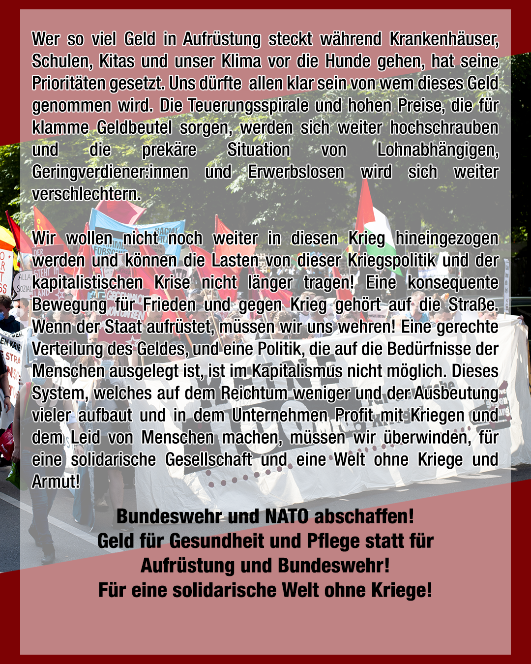 Wir wollen nicht noch weiter in diesen Krieg hineingezogen werden und können die Lasten von dieser Kriegspolitik und der kapitalistischen Krise nicht länger tragen! Eine konsequente Bewegung für Frieden und gegen Krieg gehört auf die Straße. Wenn der Staat aufrüstet, müssen wir uns wehren! Eine gerechte Verteilung des Geldes, und eine Politik, die auf die Bedürfnisse der Menschen ausgelegt ist, ist im Kapitalismus nicht möglich. Dieses System, welches auf dem Reichtum weniger und der Ausbeutung vieler aufbaut und in dem Unternehmen Profit mit Kriegen und dem Leid von Menschen machen, müssen wir überwinden, für eine solidarische Gesellschaft und eine Welt ohne Kriege und Armut!