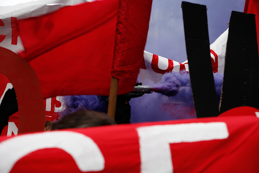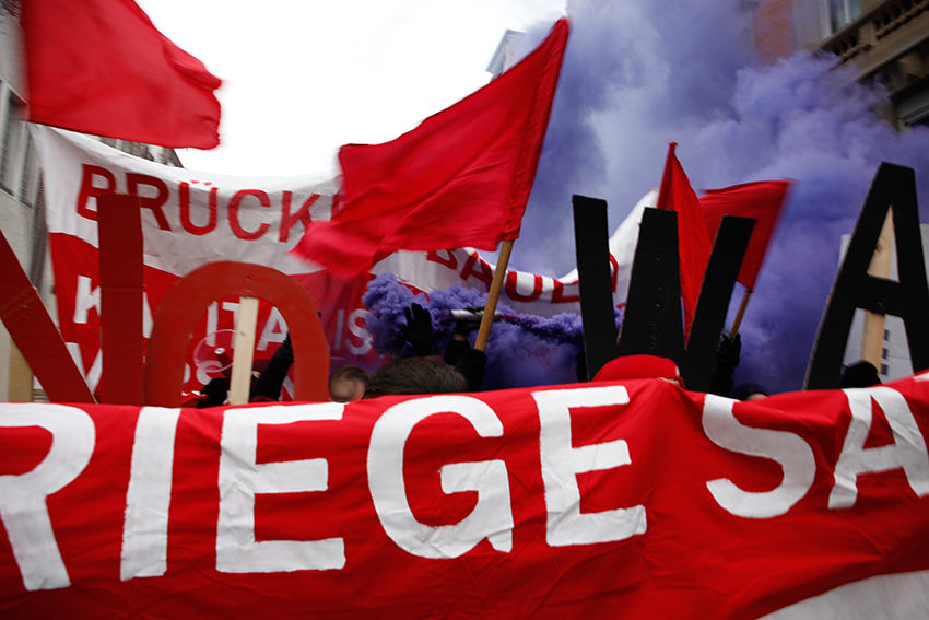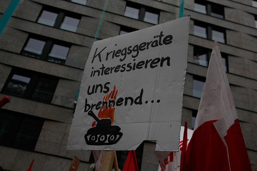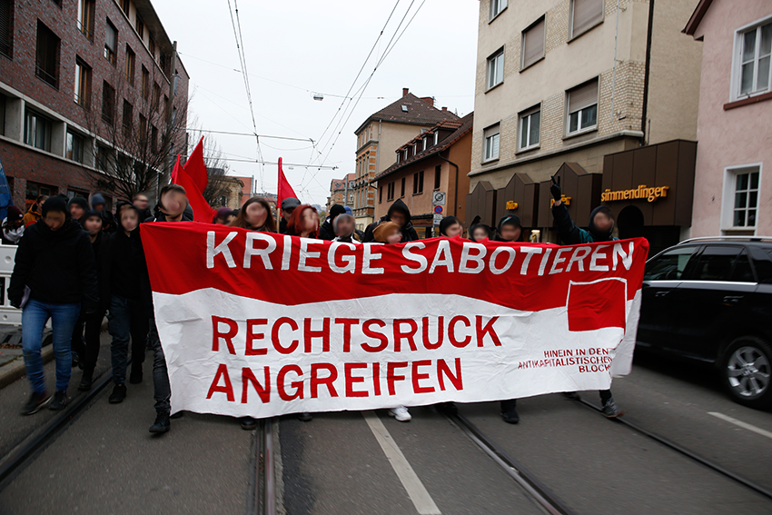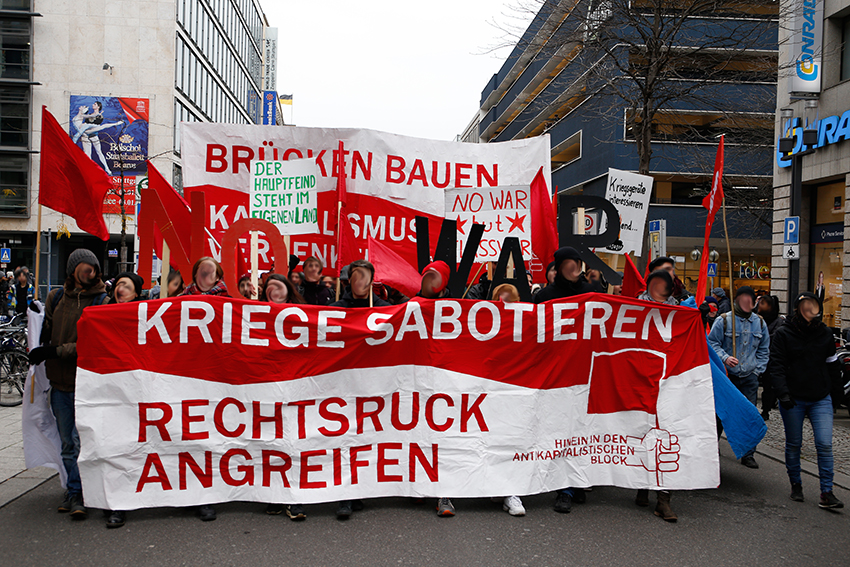 Eine Fahnen- und Rauch Choreographie begleitete den Redebeitrag des Antikapitalistischen Blocks und verstärkte die Aufforderung der Rednerin sich zu organisieren, ob in Betrieben, der Schule oder in politischen Initiativen und betonte die Wichtigkeit eine starke antimilitaristische Bewegung aufzubauen.
