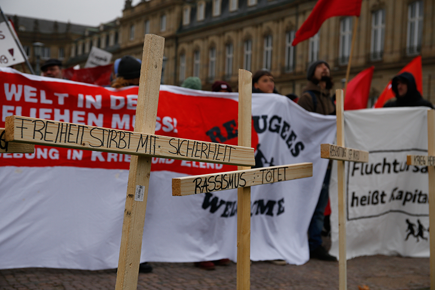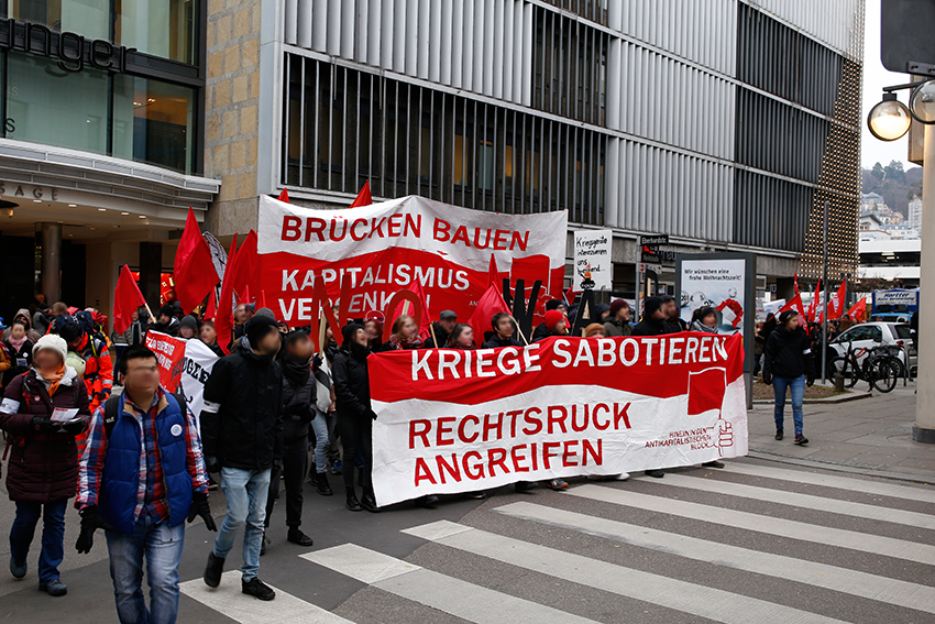 Ein Rauchtopf im Antikapitalistischen Block sorgte gegen Ende noch für einen kraftvollen und lautstarken Abschluss. Angekommen zur Abschlusskundgebung am Marienplatz hielten Luigi Pantisano (Stadtrat der Linken/ SÖS) und eine Aktivistin des Antifaschistischen Aktionsbündnis Stuttgart und Region zwei Redebeiträge zum Rechtsruck in Deutschland. Sie hoben hervor, dass Flüchtlingssolidarität und Antifaschismus nicht voneinander zu trennen sind.