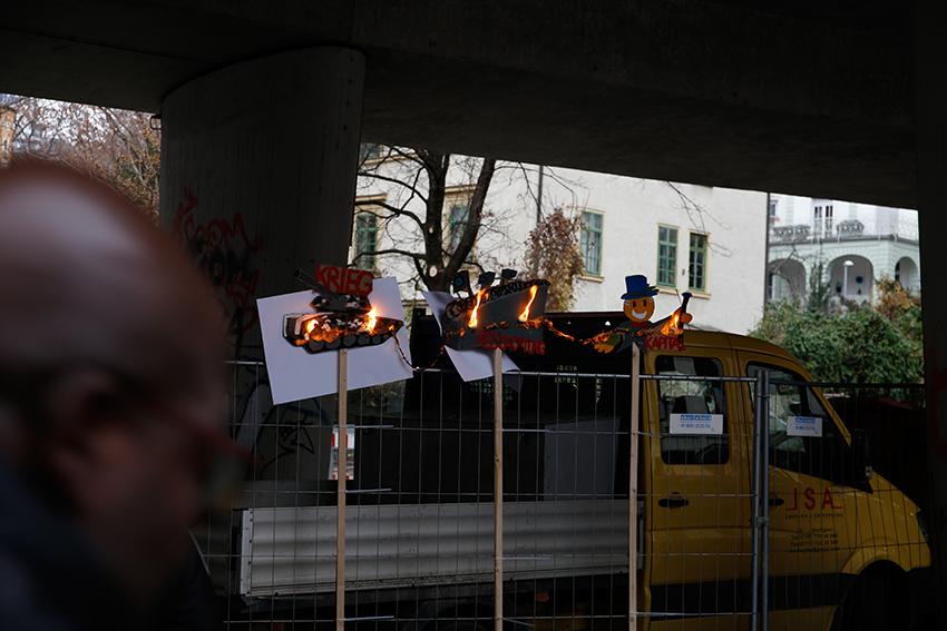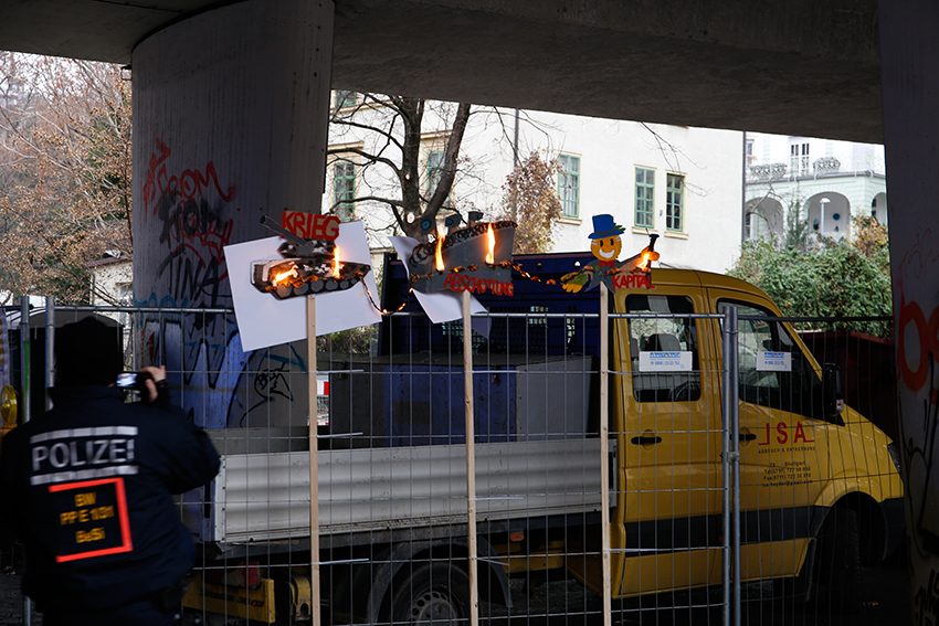Am Gerber gingen Pappschilder, die auf einer Höhe von zwei Metern am Rande der Route befestigt waren, in Flammen auf. Zu sehen waren ein Panzer, eine Grenzmauer und der Kapitalismus – die damit sowohl für die Ursachen, wie auch für die Verursachung von Flucht stehen.