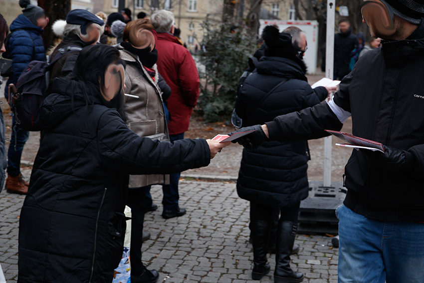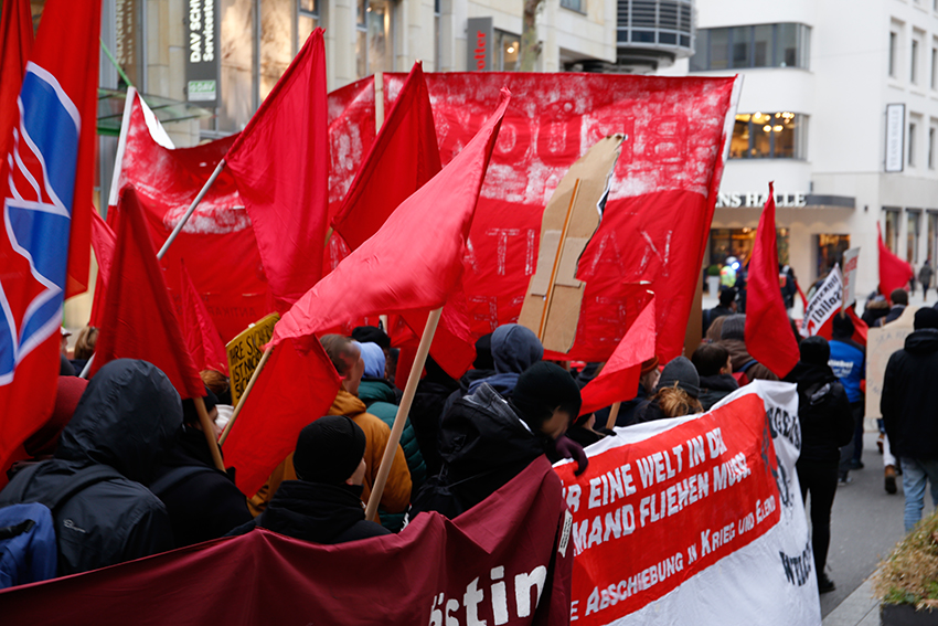 Die kraftvolle Demonstration „Für eine Welt in der niemand fliehen muss“ startete mittags mit zunächst 600 Personen vom Stuttgarter HBF aus und schlängelte sich, vorbei am Weihnachtsmarktgeschehen, durch die Stuttgarter Innenstadt. Nach und nach wuchs die Demo auf 900 Personen an. Damit hat der Protest an der vorherigen winterlichen Antikriegsmobilisierung in 2017 zu Fluchtursachen angeknüpft. Lausige null Grad und einige Schneeflocken haben Flüchtlingsinitiativen, Antikriegsgruppen und antifaschistische Initiativen nicht davon abgehalten gemeinsam zu protestieren. Mehrere Aktionen auf und während der Demo pushten die Stimmung immer wieder hoch.