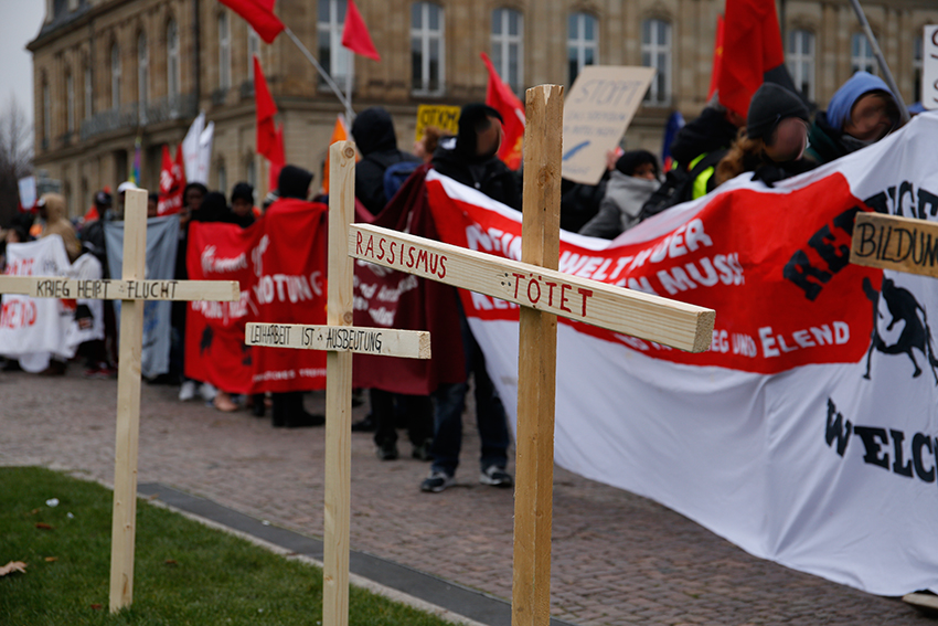 Vor dem Neuen Schloss beteiligten sie viele Demo-Teilnehmerinnen daran Kreuze in Gedenken an die Toten im Mittelmeer in die Wiese zu schlagen. Dort waren Aufschriften wie bspw. „Rassismus/ Abschottung tötet“ zu lesen. Dies und die Rolle Deutschlands prangerte auch der Sprecher der Informationsstelle Militarisierung und stellvertretender Vorsitzender der Partei die Linke Tobias Pflüger an. Die Konsequenzen der militärisch hoch aufgerüsteten EU am Mittelmeer spüren nicht nur die Geflüchteten, die dort ums Leben kommen, sondern auch immer stärker die SeenotretterInnen. Den HelferInnen, die ihren Prozess bald bevorstehen haben, droht bis zu zehn Jahre Haft – wie wichtig diese Arbeit, trotz all dieser Verfolgung bleibt, legte auch der Seawatch Aktivist Markus zu Beginn der Demo dar.