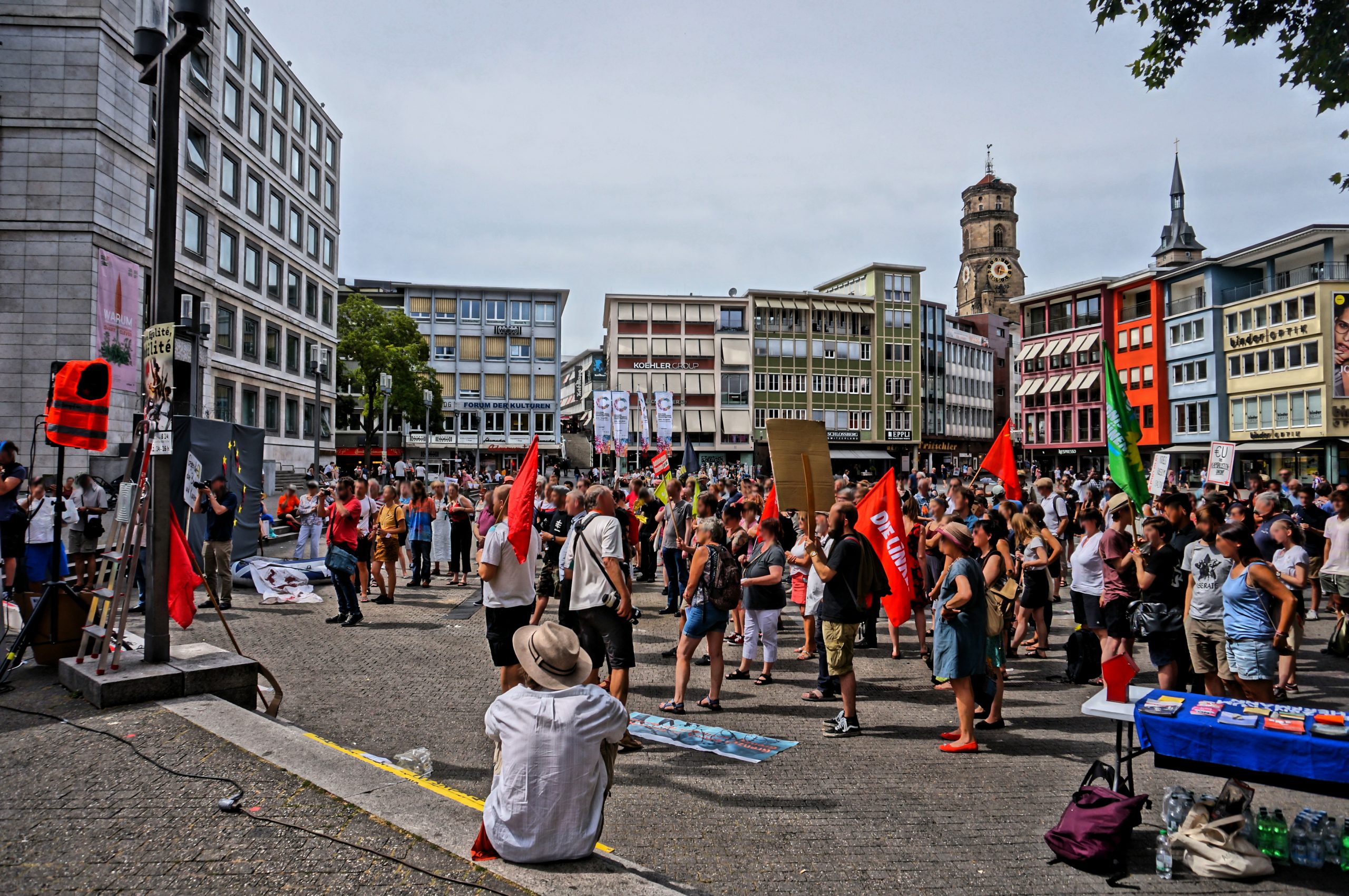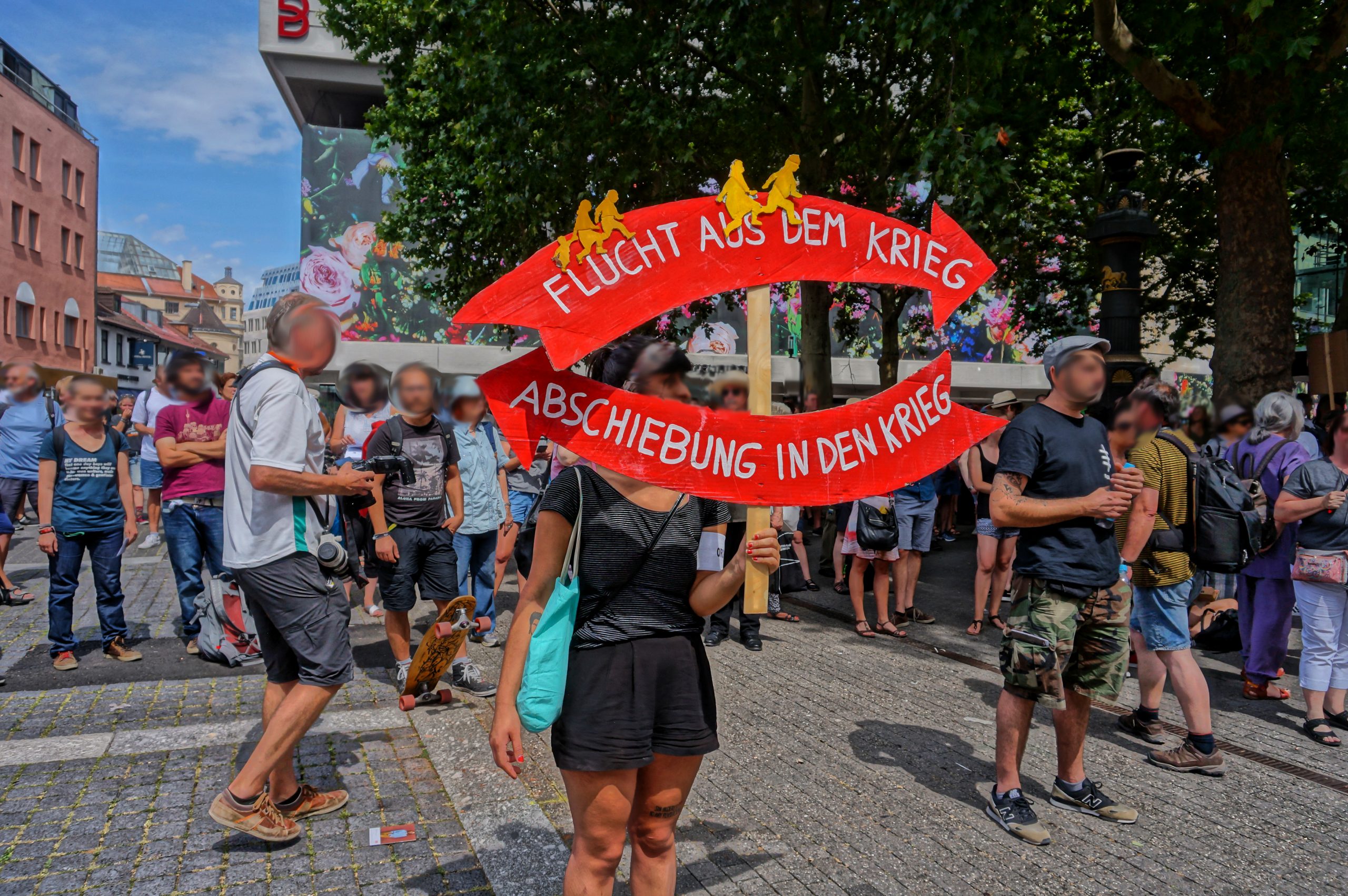 In über 100 Städten bundesweit fanden heute Kundgebungen und Demonstrationen statt. An der Stuttgarter Kundgebung nahmen ca. 200 Personen teil. Mit verschiedenen Reden, Schildern, Transparenten und einer Installation, die das Morden an den EU-Außengrenzen darstellt, wurde auf die Thematik aufmerksam gemacht.