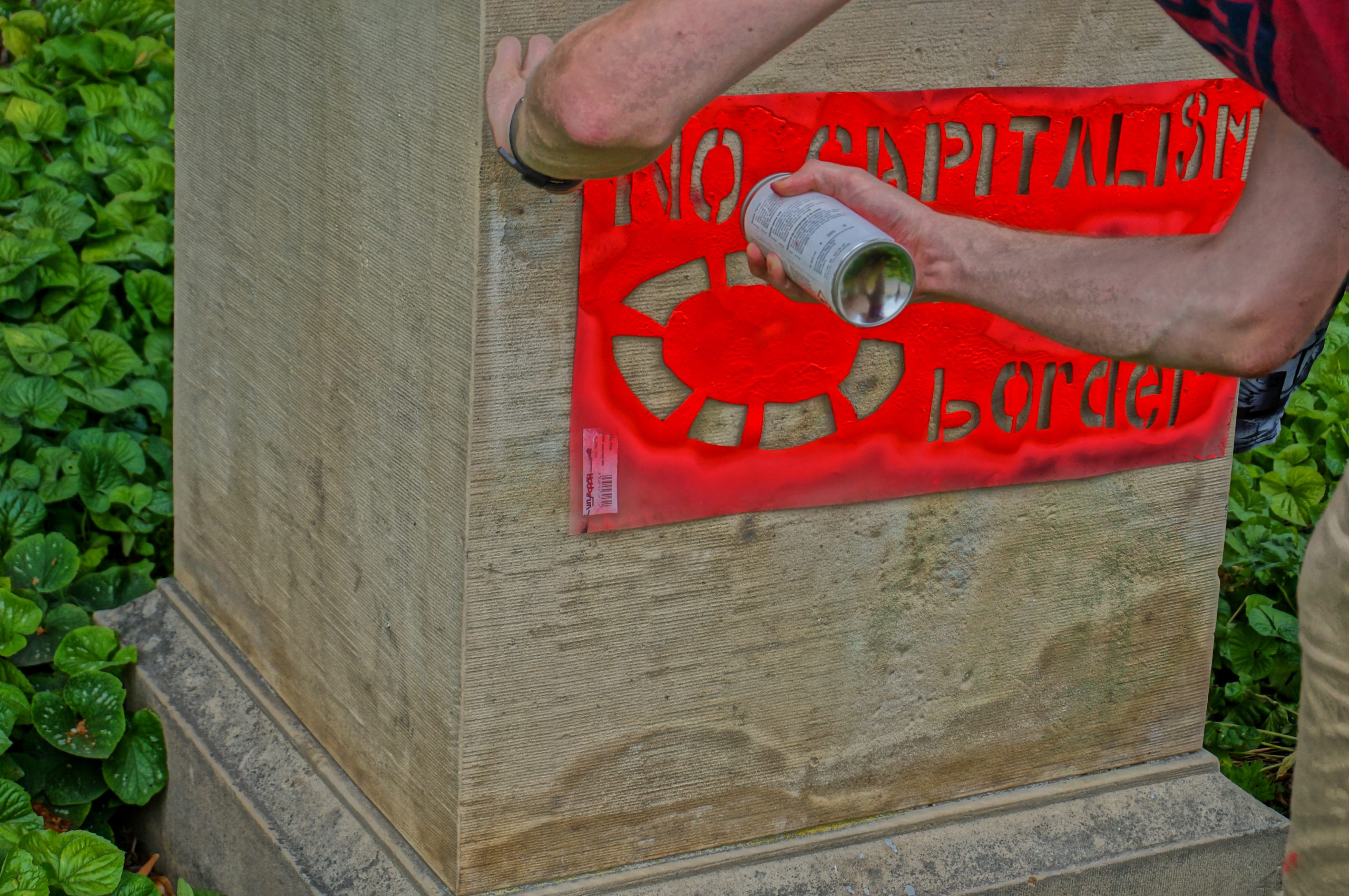 Anschließend an die Kundgebung zogen die KundgebungsteilnehmerInnen durch die Stuttgarter Innenstadt und machten im Stadtbild auf die Thematik aufmerksam. Statuen wurden mit orangenen Warnwesten bekleidet, Plakate aufgehängt und Schablonen gesprüht.