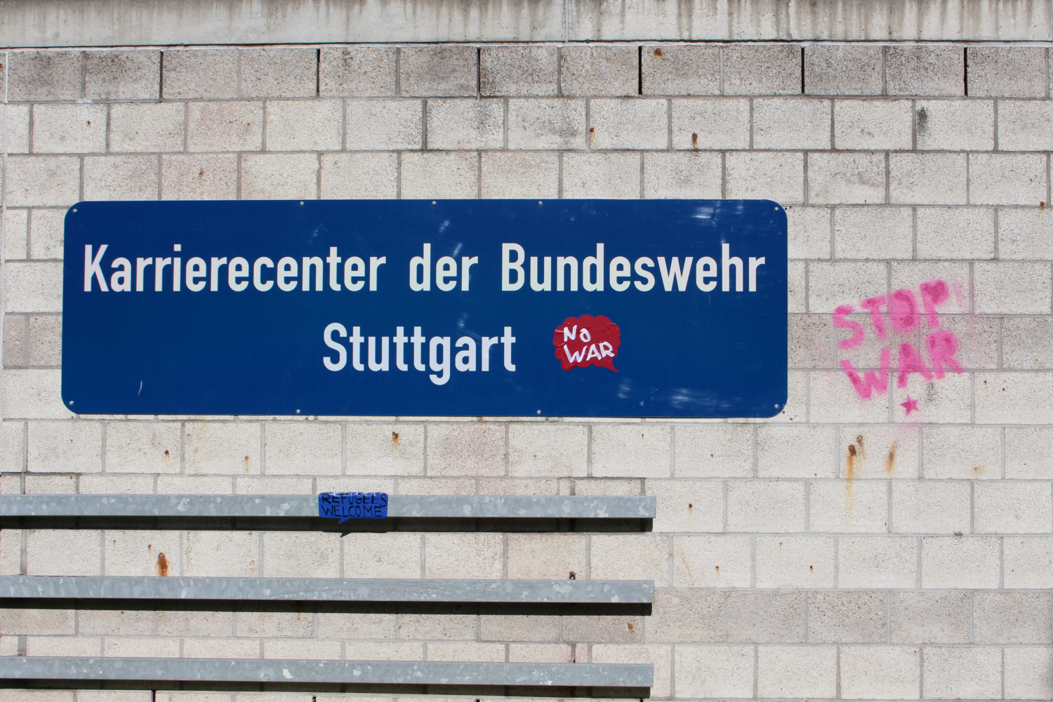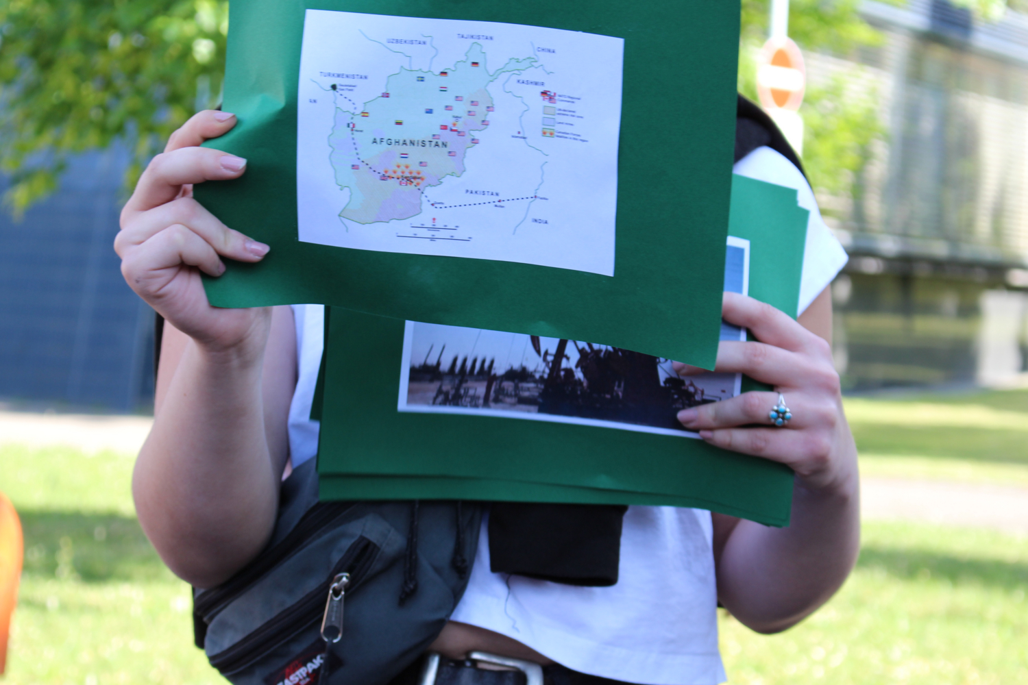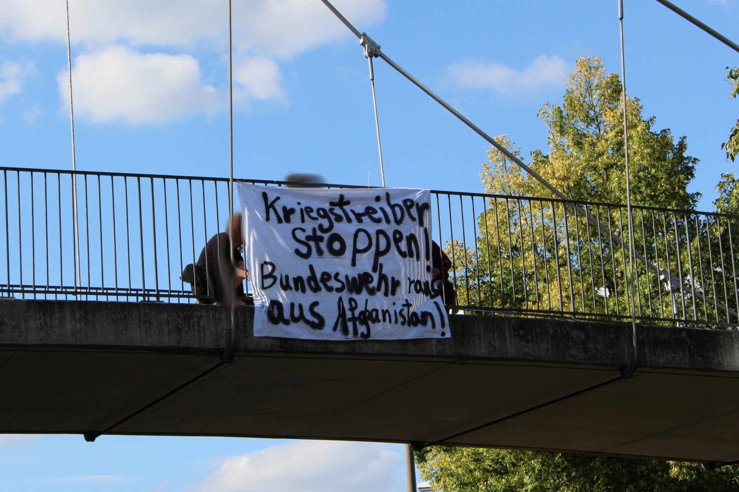 Nach gemeinsamer Bastelphase machten wir uns auf den Weg in die Innenstadt zum Treffpunkt, bei dem sich uns weitere Interessierte anschlossen. Die erste Aktion am Eckensee beschäftigte sich mit der europäischen und deutschen Abschottungspolitik. In Form einer Rede wurde deutlich, dass diese Politik tausende Todesopfer zur Folge hat. Als nächstes erläuterte ein Aktivist der Flüchtlingsbewegung das Vorgehen des Innenministeriums gegenüber Geflüchteten und der Repression gegenüber flüchtlingssolidarischen Initiativen. Nach dem Beitrag haben wir uns zum Rüstungsunternehmen Thales begeben, das einen Standort am Bahnhof hat. Hier wurde darauf eingegangen wie die von Thales produzierten Rüstungsgüter bei Kriegen und tödlicher Grenzsicherung eingesetzt werden. Die letzte Aktion bezog sich auf die Rekrutierungspropaganda der Bundeswehr, die an der Löwentorbrücke stattfand. Zudem wurde am Karriere Center der Bundeswehr auf den Kriegseinsatz in Afghanistan aufmerksam gemacht.