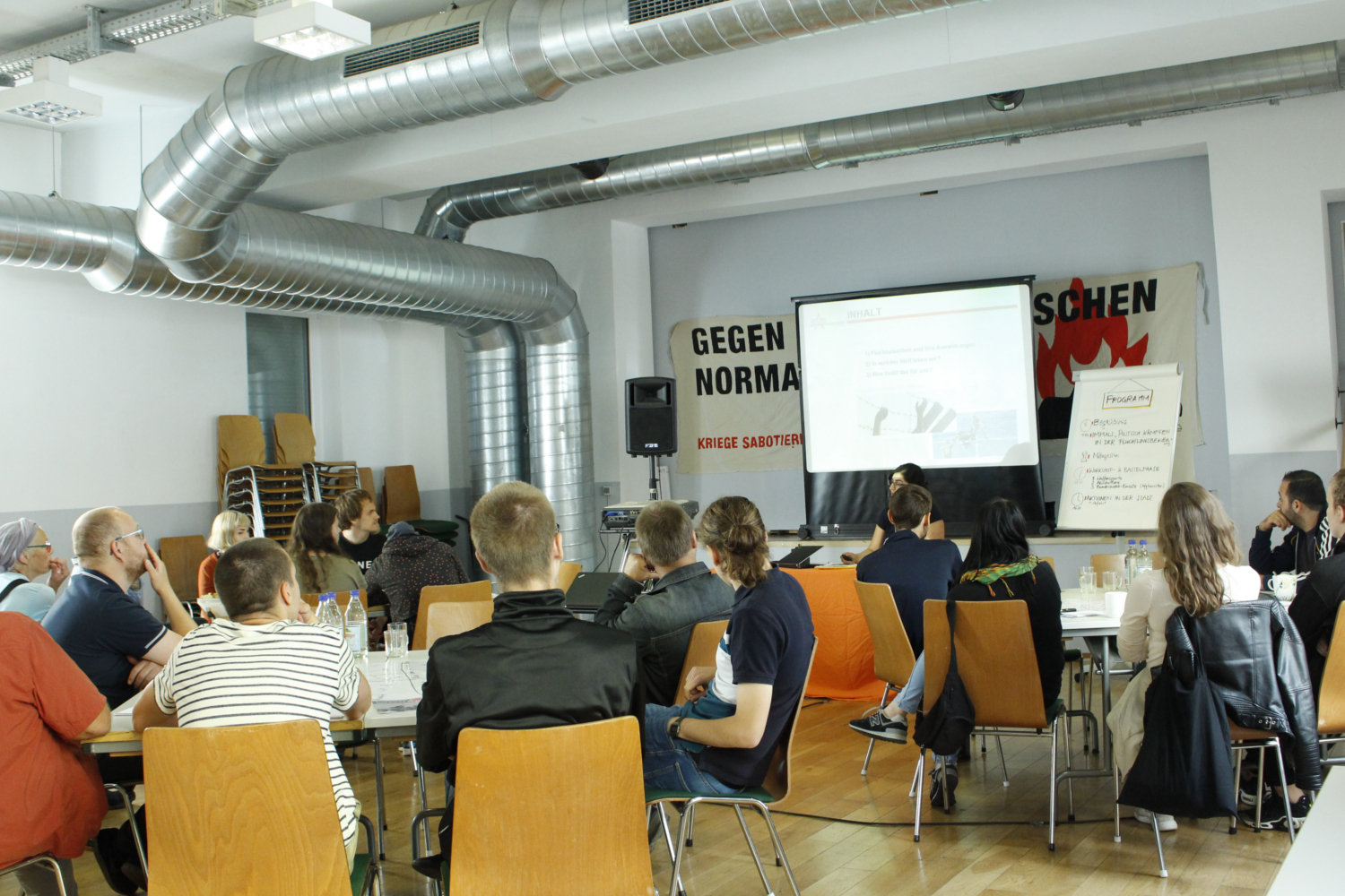 Der Tag richtete sich an ehrenamtliche Helfer und Helferinnen die sich in der unterstützenden Flüchtlingshilfe engagieren sowie Interessierte. Wir wollten eine eine politische Auseinandersetzung mit dem Thema Fluchtursachen anregen und insbesondere die Zusammenhänge zwischen Krieg und Flucht aufzeigen.