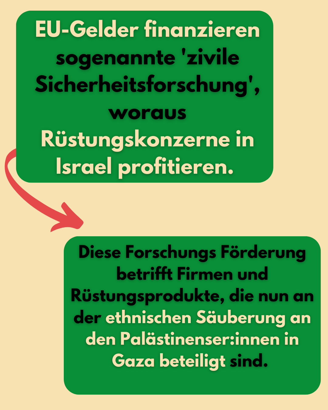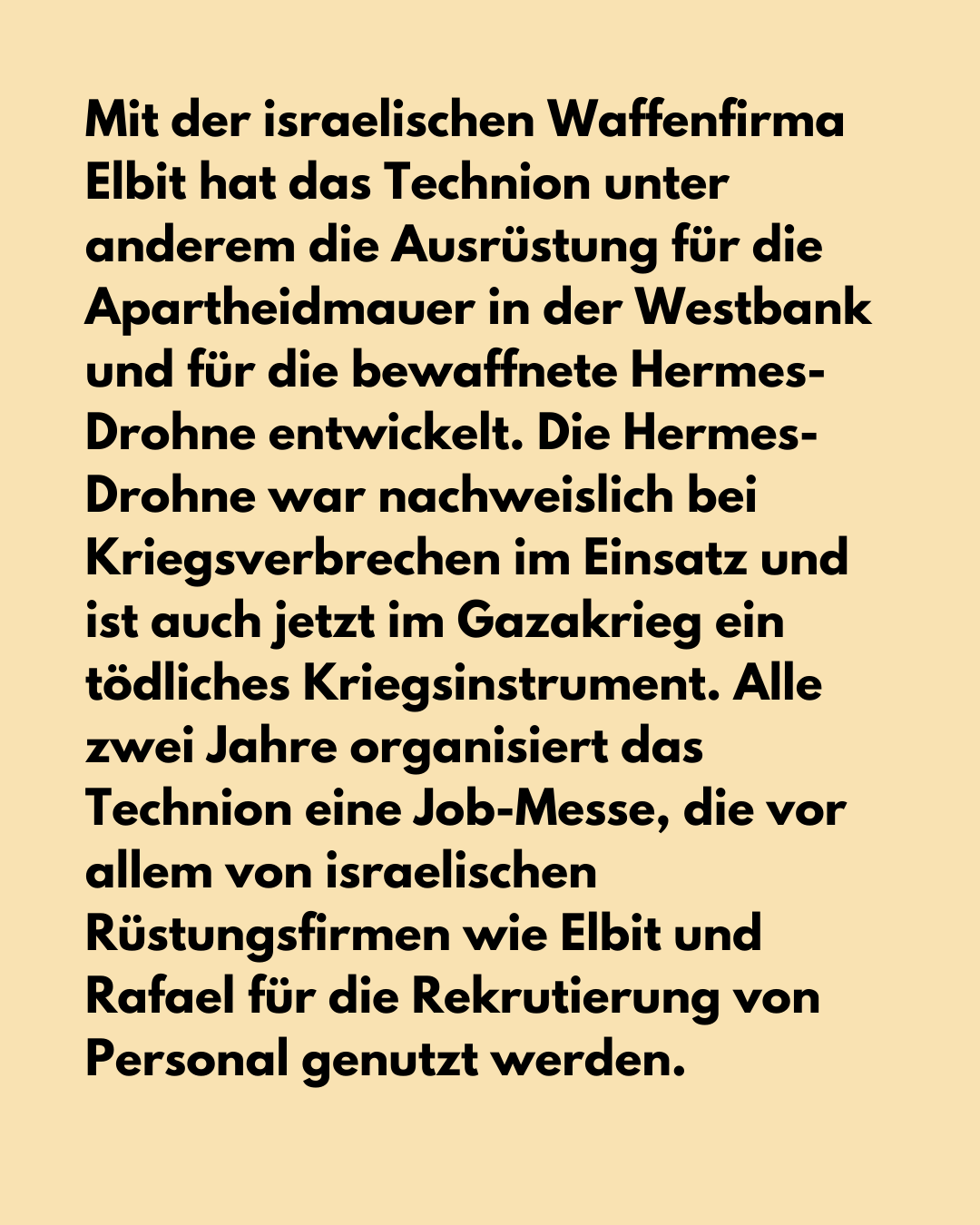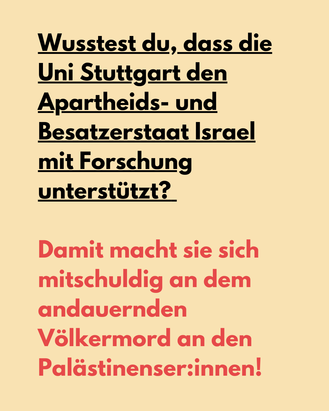 - Wehrt euch gegen die Kooperation der Stuttgarter Forschungseinrichtungen mit akademischen Einrichtungen und Rüstungsfirmen, die dem israelischen Militär zuarbeiten, wie Elbit, Rafael Advanced System und Technion Haifa!