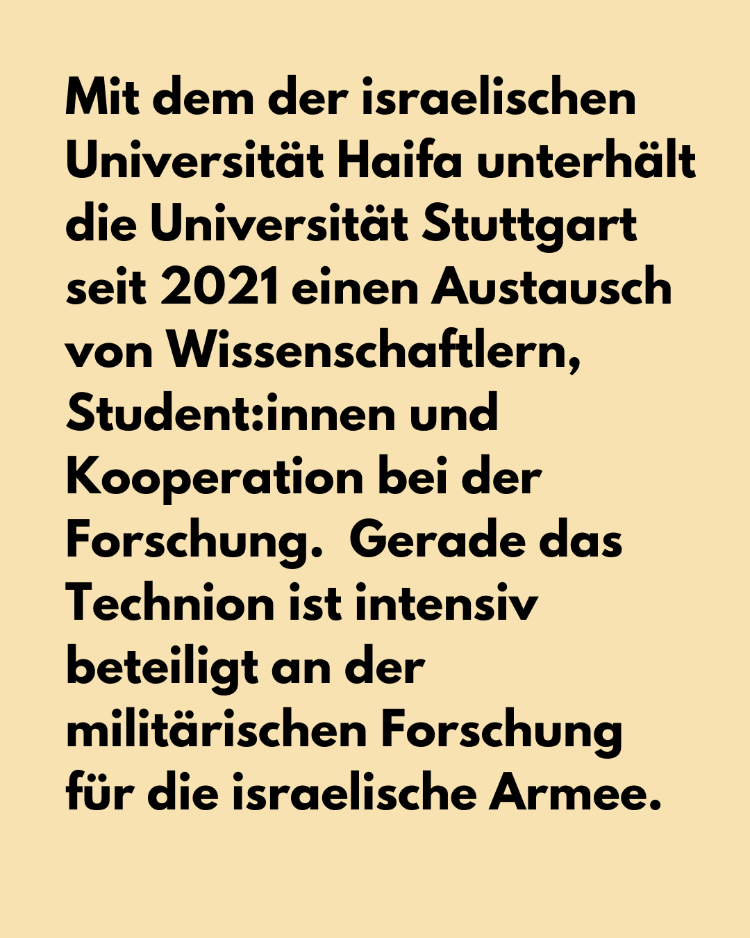 Mit dem Technion der israelischen Universität Haifa unterhält die Universität Stuttgart seit 2021 einen Austausch von Wissenschaftlern, Student:innen und Kooperation bei der Forschung auf der Grundlage eines Abkommens. Gerade das Technion ist intensiv beteiligt an der militärischen Forschung für die israelische Armee. Der vom Technion mit entwickelte ferngesteuerte D9 Bulldozer ist seit vielen Jahren im Einsatz bei der Zerstörung palästinensischer Häuser und Olivenhaine in der Westbank, derzeit sind hunderte Exemplare dieser Maschine beteiligt an der Verwüstung palästinensischer Städte und Dörfer im Gazastreifen. Mit der israelischen Waffenfirma Elbit hat das Technion unter anderem die Ausrüstung für die Apartheidmauer in der Westbank und für die bewaffnete Hermes-Drohne entwickelt. Die Hermes-Drohne war nachweislich bei Kriegsverbrechen im Einsatz und ist auch jetzt im Gazakrieg ein tödliches Kriegsinstrument. Alle zwei Jahre organisiert das Technion eine Job-Messe, die vor allem von israelischen Rüstungsfirmen wie Elbit und Rafael für die Rekrutierung von Personal genutzt werden.