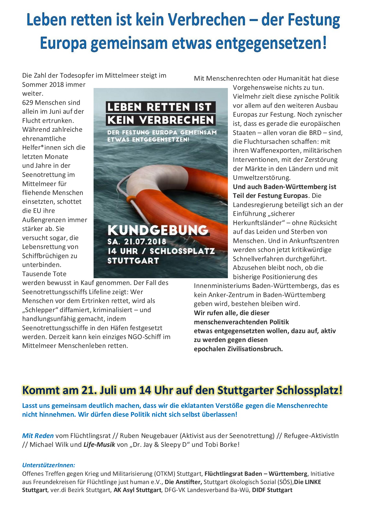 Mit Reden vom Flüchtlingsrat // Ruben Neugebauer (Aktivist aus der Seenotrettung) // Refugee-AktivistIn // Michael Wilk und Life-Musik von „Dr Jay & Sleepy D“ und Toba Borke, Freestyle-Rapper
