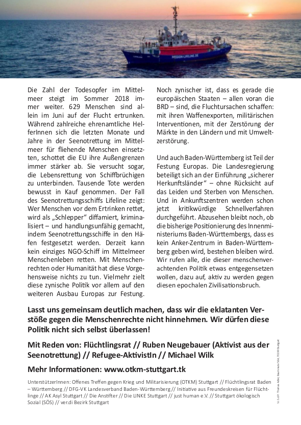 Während zahlreiche ehrenamtliche Helfer*innen sich die letzten Monate und Jahre in der Seenotrettung im Mittelmeer für fliehende Menschen einsetzten, schottet die EU ihre Außengrenzen immer stärker ab. Sie versucht sogar, die Lebensrettung von Schiffbrüchigen zu unterbinden. Tausende Tote werden bewusst in Kauf genommen. Der Fall des Seenotrettungsschiffs Lifeline zeigt: Wer Menschen vor dem Ertrinken rettet, wird als „Schlepper“ diffamiert, kriminalisiert – und handlungsunfähig gemacht, indem Seenotrettungsschiffe in den Häfen festgesetzt werden. Derzeit kann kein einziges NGO-Schiff im Mittelmeer Menschenleben retten.