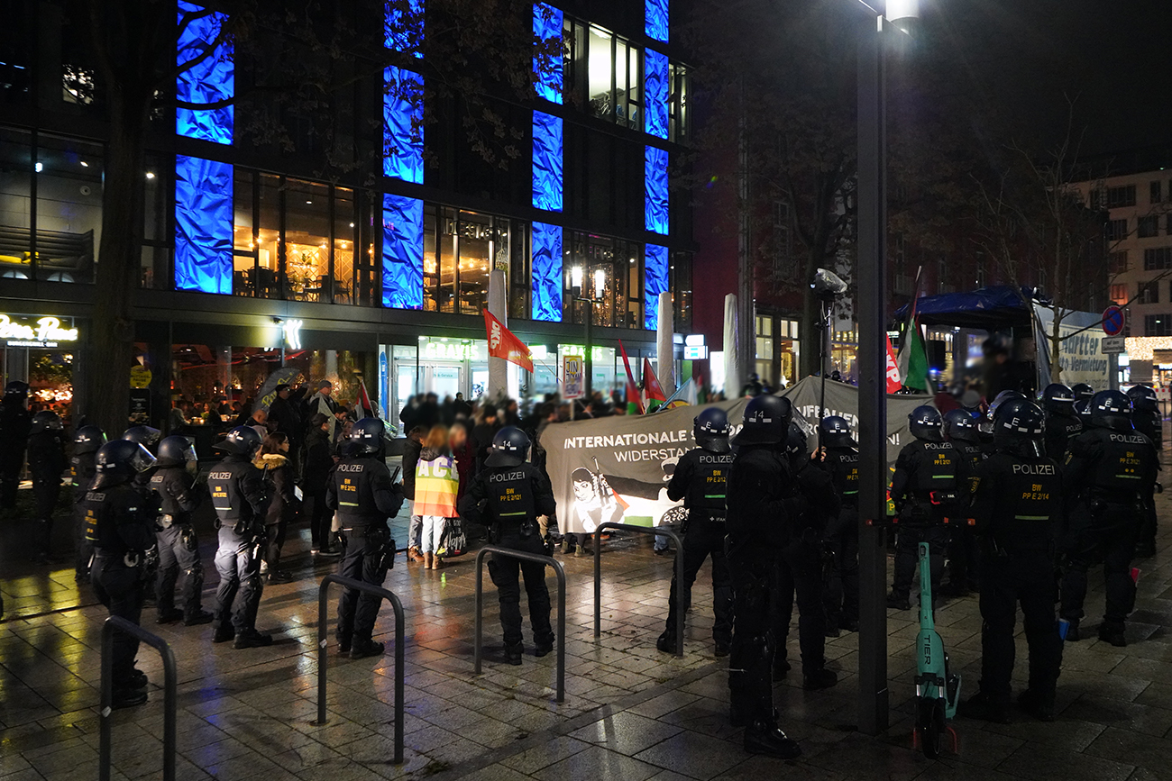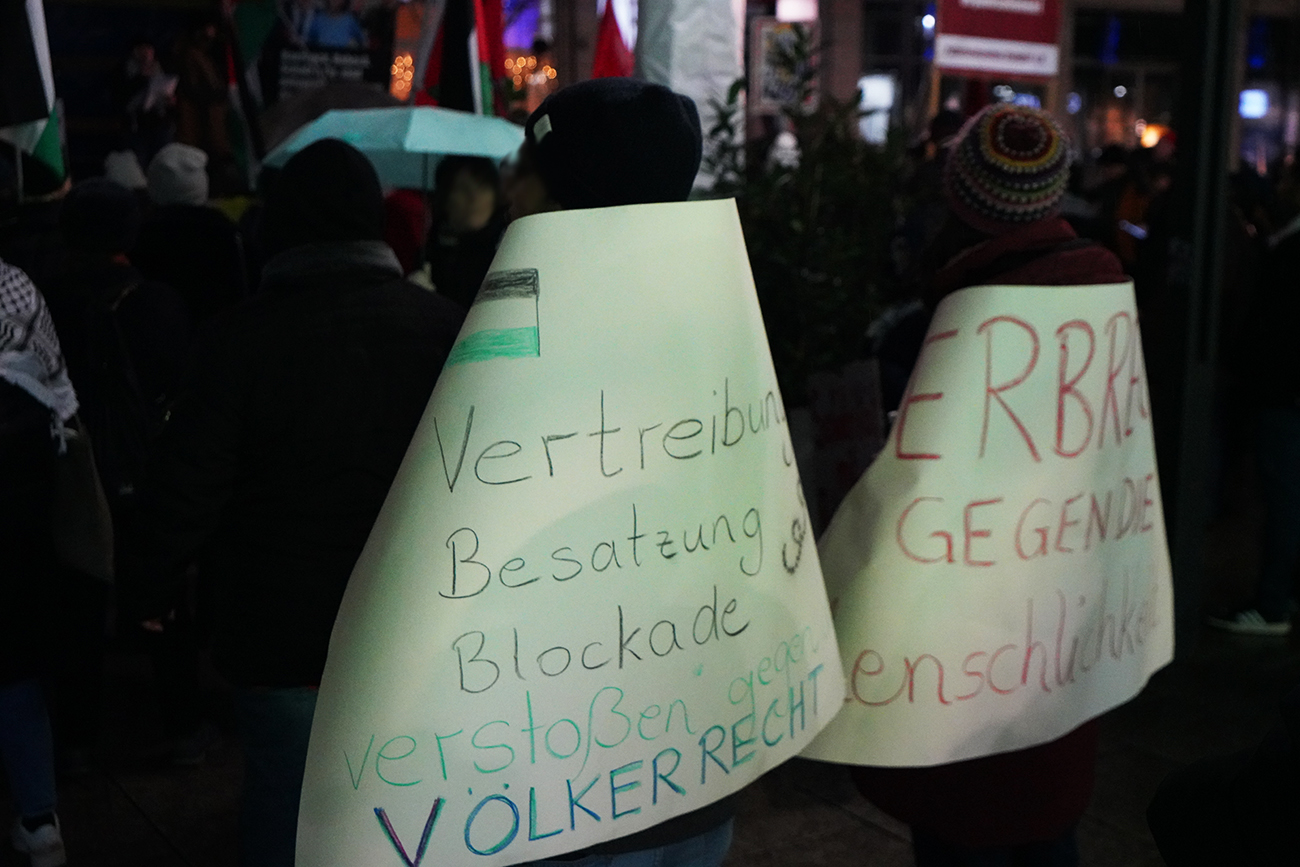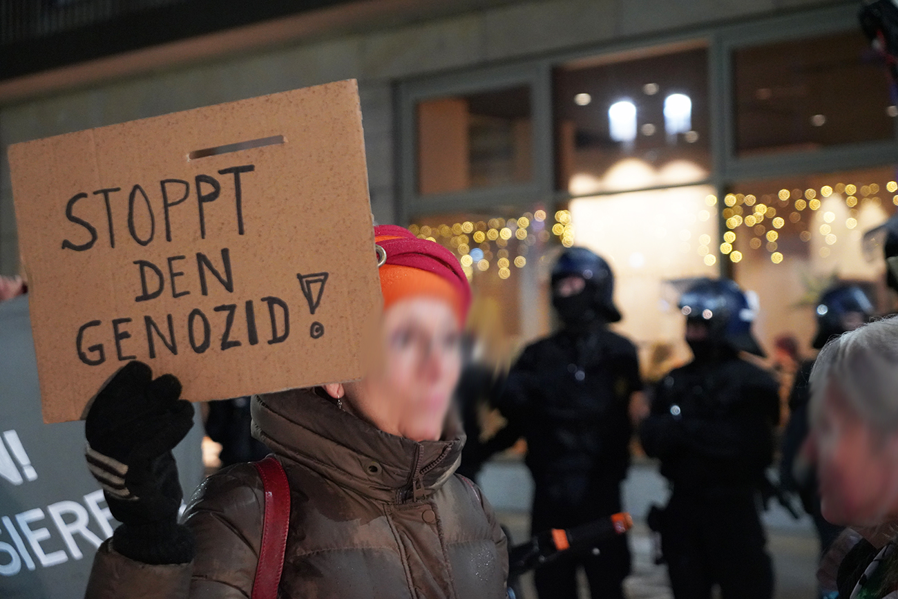 Am Freitag, den 08.12.23, fand eine Demonstration gegen den Genozid am palästinensischen Volk durch den zionistischen Apartheidstaat Israel statt. Leider konnten die Demonstrierenden keinen Meter laufen, da die Polizei die Versammlung willkürlich abgeriegelt hatte. Dies hielt die Menschen nicht davon ab, weiterhin vor Ort zu bleiben und die Stimmen der Stimmlosen zu sein. Die ca. 200 Teilnehmenden solidarisierten sich mit dem palästinensischen Volk, das seit zwei Monaten durch das israelische Militär vertrieben und massakriert wird. Der anhaltende Genozid forderte bereits über 17.000 ermordete Zivilist:innen, von denen mehr als 7000 Kinder sind, und das Morden geht weiter. Gemordet wird mit deutschen Waffen, deren Lieferung nach Israel sich seit letztem Jahr verzehnfacht haben. Deutsche Rüstungsunternehmen verdienen Milliarden durch diesen Krieg und die deutsche Polizei versucht, dieses Interesse auf den Stuttgarter Straßen durchzusetzen.