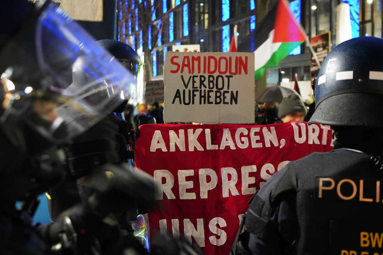 Es hat sich relativ schnell gezeigt, dass die Stuttgarter Polizei nicht vorhatte, die Demonstration laufen zu lassen. Sie griff sich lächerliche Begründungen wie das angeblich falsche Vorlesen der Auflagen aus der Luft, um ihr repressives Vorgehen zu rechtfertigen. Auch ein Schild, das die Aufhebung des Verbots des linken Gefangenennetzwerks Samidoun forderte, war Anlass genug, einen Teilnehmenden brutal festzunehmen. Der repressive Staat hat heute wieder mal sein hässliches Gesicht gezeigt: die Meinungsfreiheit und das Demonstrationsrecht wurden mit Füßen getreten.