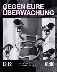 Umso wichtiger ist es, dass wir uns mit den Ludwigsburger Jugendlichen solidarisieren und gemeinsam mit ihnen am 13.12 um 18 Uhr am Marstall in Ludwigsburg auf die Straße gehen.Lassen wir die Jugendlichen mit ihrer Wut auf diese staatlichen Strukturen und seine hochgerüsteten Repressionsorgane gerade am 13.12. nicht allein.