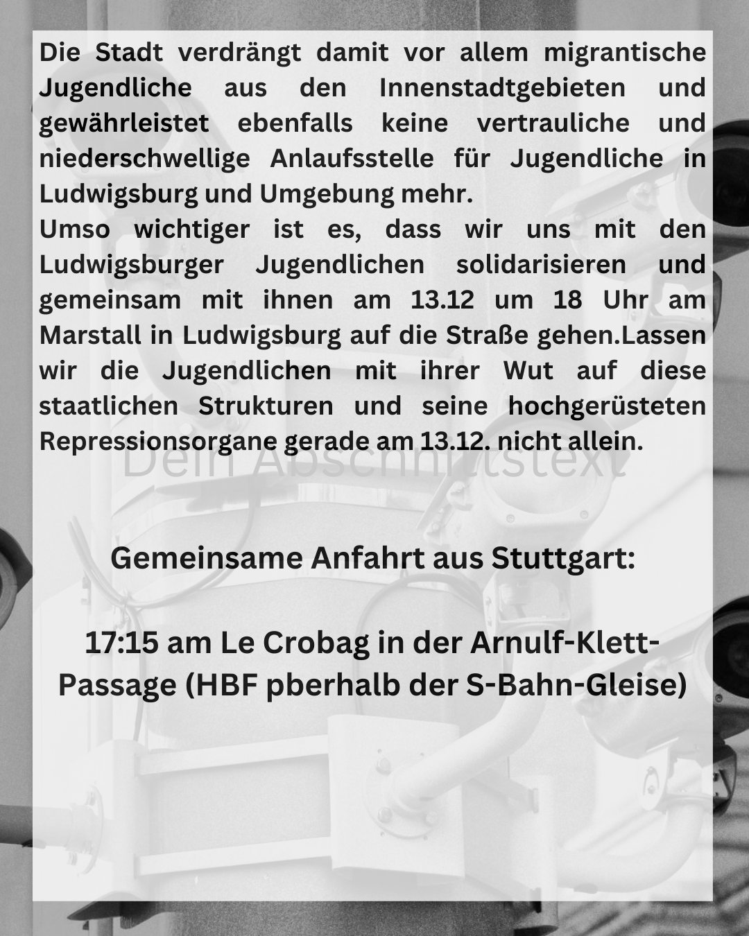 Umso wichtiger ist es, dass wir uns mit den Ludwigsburger Jugendlichen solidarisieren und gemeinsam mit ihnen am 13.12 um 18 Uhr am Marstall in Ludwigsburg auf die Straße gehen.Lassen wir die Jugendlichen mit ihrer Wut auf diese staatlichen Strukturen und seine hochgerüsteten Repressionsorgane gerade am 13.12. nicht allein.