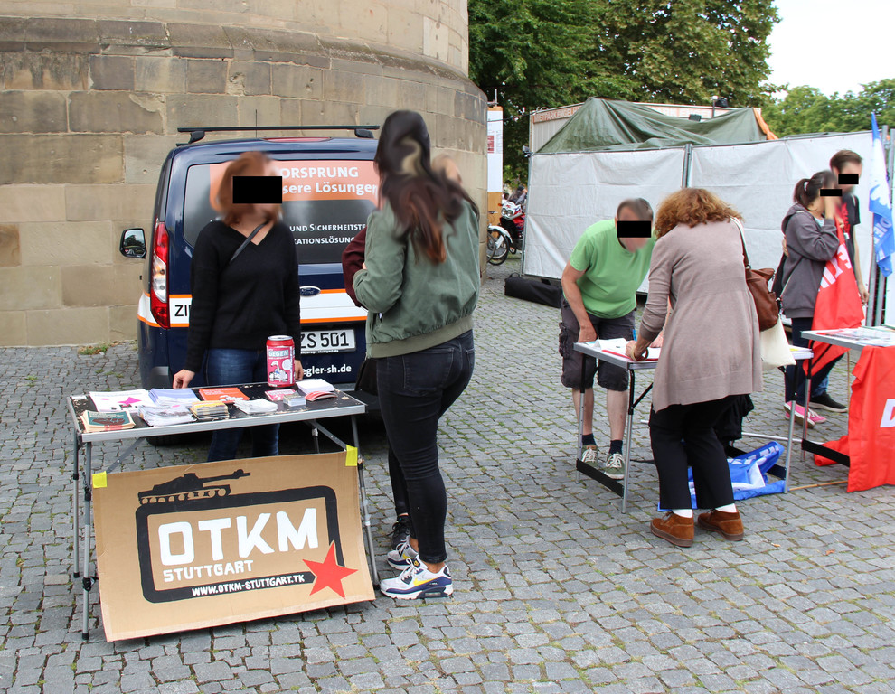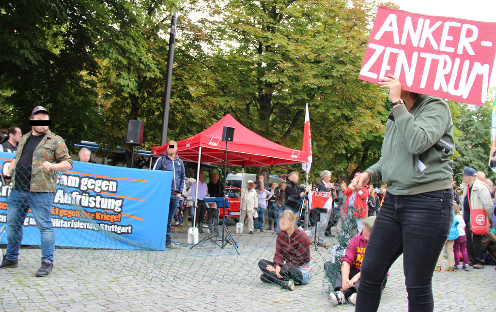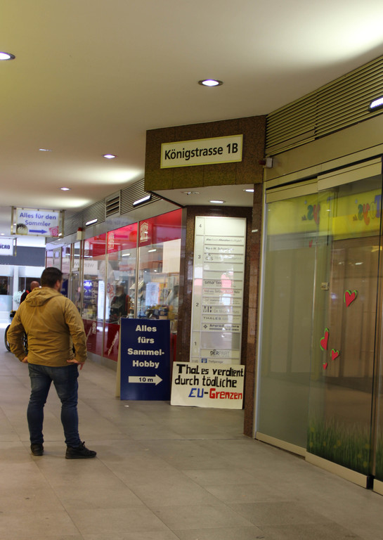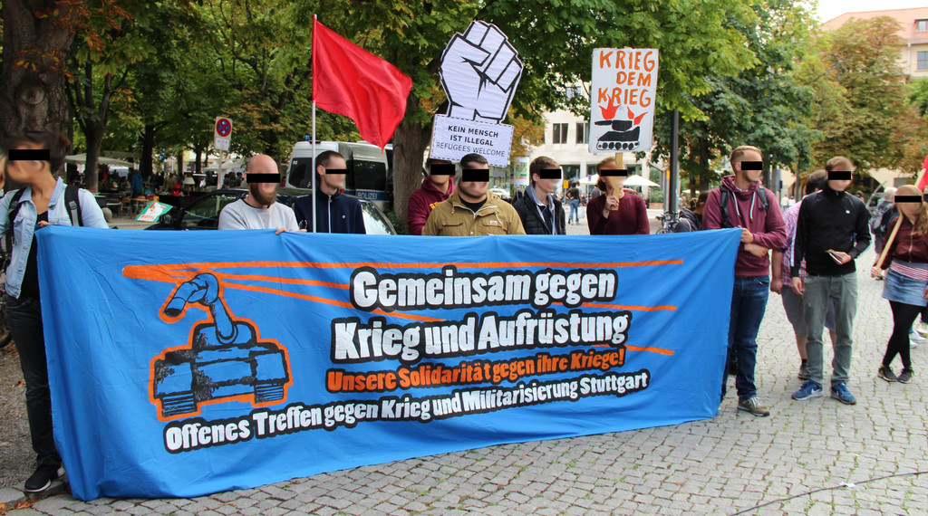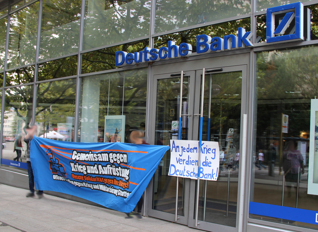 Als viertgrößter Waffenexporteur und durch dutzende Auslandseinsätze der Bundeswehr mischt Deutschland im internationalen Kriegs- und Rüstungsgeschehen kräftig mit. Da auch viele Unternehmen, Rüstungskonzerne und Banken vom tödlichen Geschäft profitieren, begannen wir den heutigen Antikriegstag mit einer Transparent-Aktion in der Innenstadt. Zuerst besuchten wir das Büro von Thales am Hauptbahnhof. Thales ist einer der größten Rüstungsriesen weltweit, ein Konzern, der u.a. Technologien zur Grenzüberwachung entwickelt und herstellt. Damit profitiert der Konzern von der menschenverachtenden EU-Abschottungspolitik an den Außengrenzen. Als nächstes besuchten wir eine Deutsche Bank Filiale am Rotebühlplatz. Die Deutsche Bank ist Geldgeber von acht Rüstungsfirmen und investiert hierzulande etwa in den U-Bootbau bei Thyssenkrupp und in den Rüstungskonzern Rheinmetall. Panzer von Rheinmetall kamen z.B. beim völkerrechtswidrigen Angriffskrieg der türkischen Armee gegen die hauptsächlich von KurdInnen bewohnte Region Afrin in Nordsyrien zum Einsatz. Die DWS, Investment-Tochter der Deutschen Bank, hielt 2017 Anteile im Wert von 3,4 Milliarden Euro an mehreren Rüstungsfirmen. Beim lukrativen Geschäft mit Atomwaffen ist die Deutsche Bank auch vorne mit dabei: Im Jahr 2016 wurden über 4,8 Milliarden Euro in Atomwaffen-Hersteller investiert.