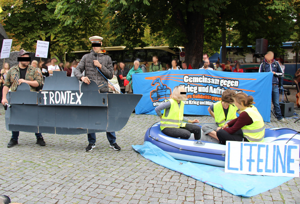 Im Anschluss an die Banneraktionen beteiligten wir uns an der offiziellen Antikriegstag-Kundgebung am Mahnmal für die Opfer des Faschismus mit einem Theaterstück, das die militärische Abschottung der EU Außengrenzen durch Frontex thematisierte, Krieg als Fluchtursache benannte und zum handfesten antimilitaristischen Widerstand aufrief.