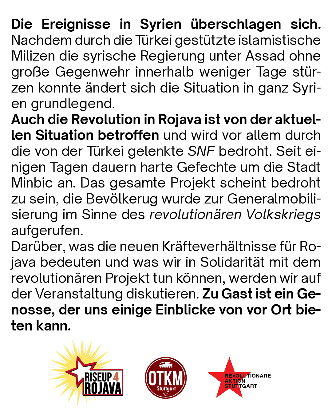 Darüber, was die neuen Kräfteverhältnisse für Rojava bedeuten und was wir in Solidarität mit dem revolutionären Projekt tun können, werden wir auf der Veranstaltung diskutieren. Zu Gast ist ein Genosse, der uns einige Einblicke von vor Ort bieten kann.